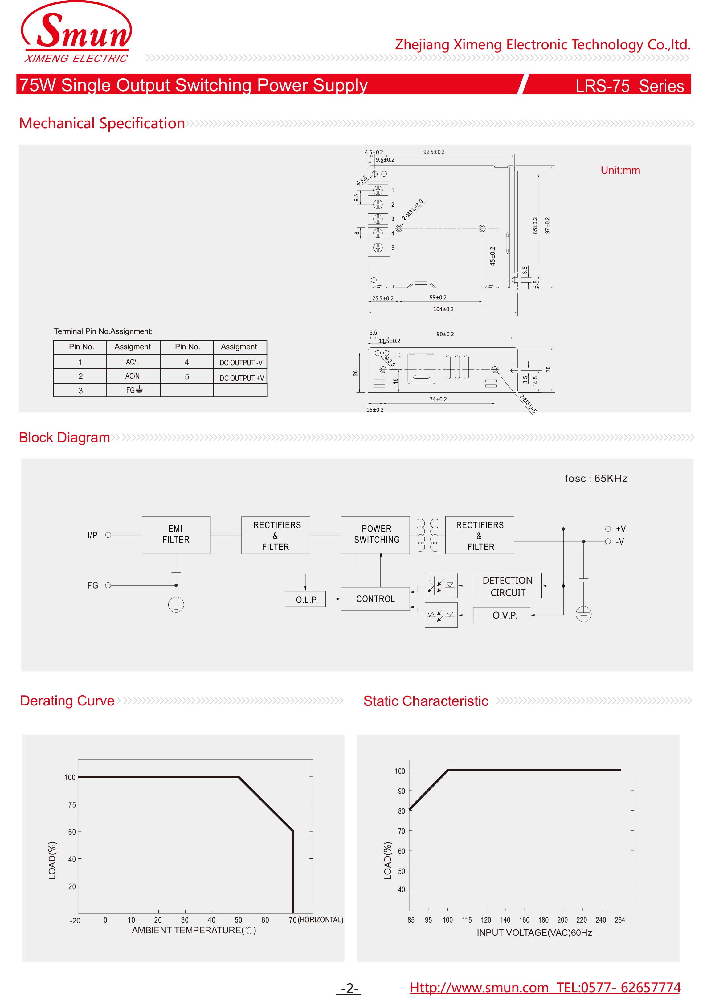 A série LRS-75 é uma fonte de alimentação do tipo fechado de saída única de 75 W com 30 mm de design de perfil baixo. Adotando a entrada de 85-264 VCA de faixa completa, toda a série fornece uma linha de tensão de saída de 5 V, 12 V, 15 V, 24 V, 36 V e 48 V .